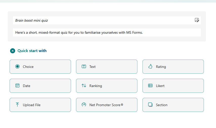 Give your quiz/form a title, add a description if you like, and select ‘Quick start with’. Select from the available question types: