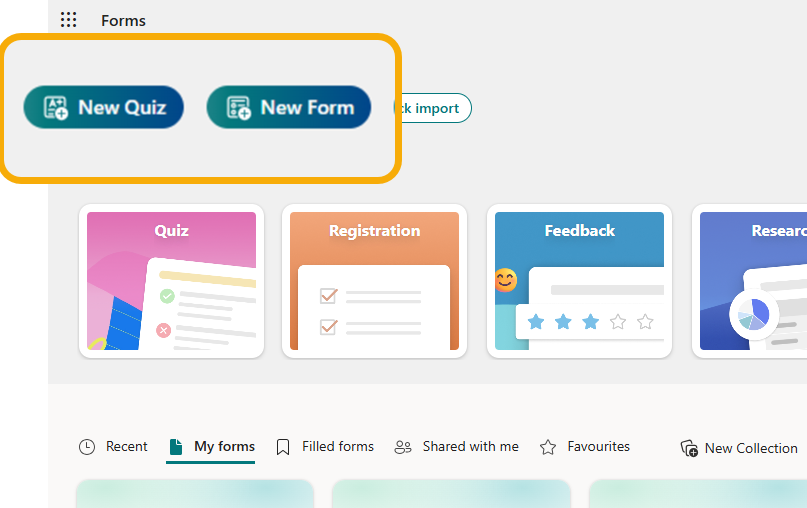 Once you’ve opened MS Forms, select ‘New Quiz’ or ‘New Form’: