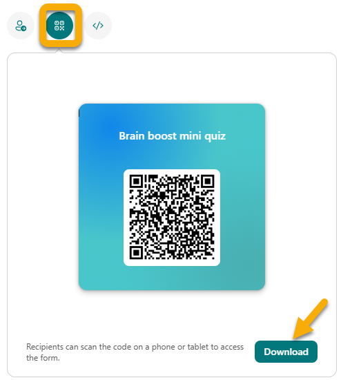 - Select the QR code button and then Download, to download the QR code as a .png file. You can insert this file where your audience can scan it with a QR code scanner (e.g. their mobile device) to access your form.