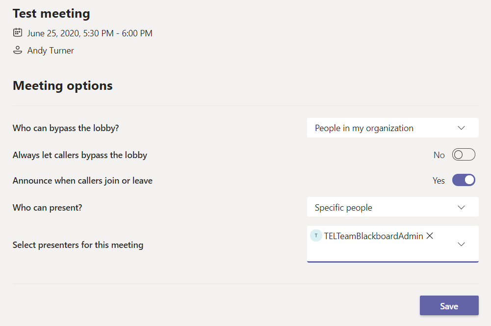 Home / Original Category Archive / MS Teams: Controlling who can present / Teams – Save meeting options Teams – Save meeting options Leave a Comment / By andyturner / June 26, 2020