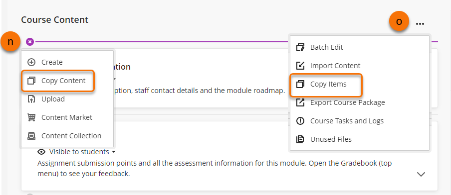 - Click on the purple plus sign anywhere on the Course Content to open the ad content menu, select Copy Content (n).