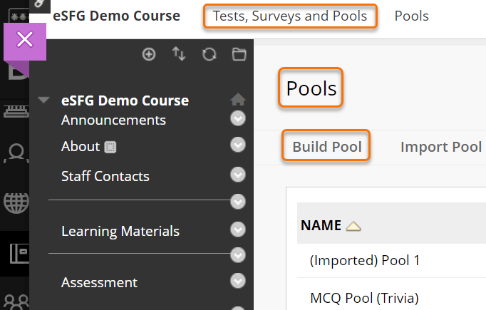 - In your original Blackboard course go to the Control Panel/Course Tools/Test, Pools and Surveys/ and then select Pools.