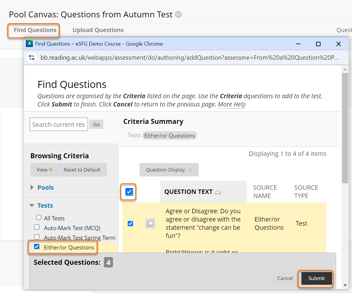- Select the questions you wish to include and click Submit.
