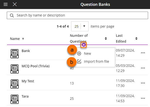 To create a new Question Bank click on the purple plus sign icon and select New (a) from the menu. A New Question Bank canvas will open.