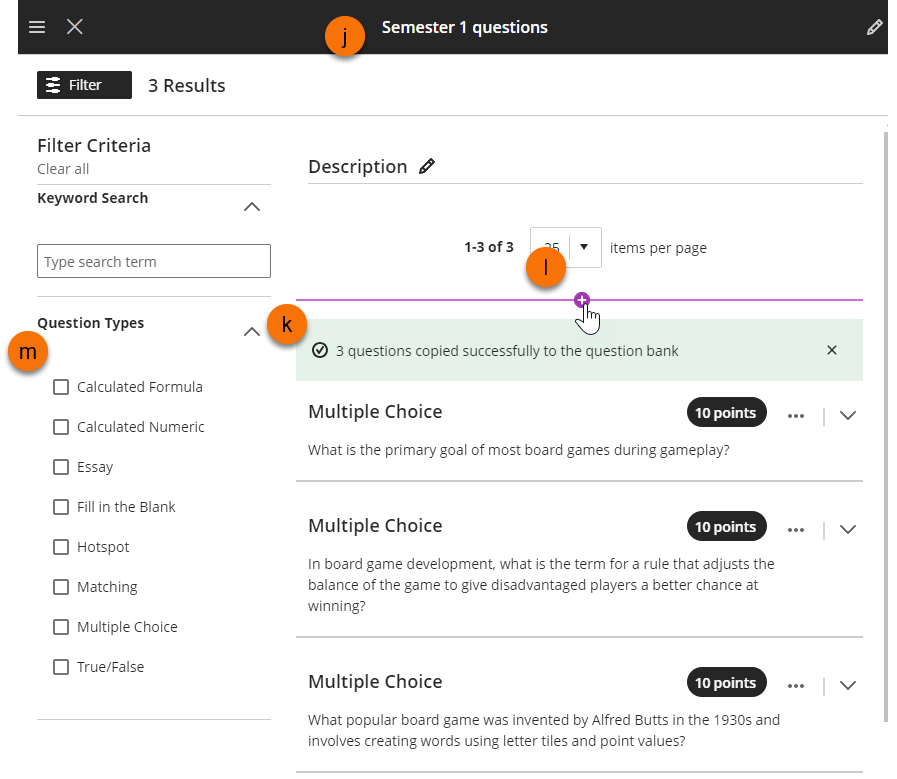 - Once the questions have been copied you will be returned to the question bank canvas (j)
