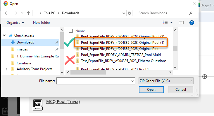 Select a zip file with the prefix Pool_ExportFile_. It is not possible to import Tests into your ultra course.