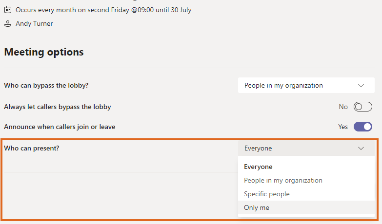Home / Original Category Archive / Setting up live online sessions via Outlook or Teams calendar / Teams meeting options – who can present Teams meeting options – who can present Leave a Comment / By andyturner / September 17, 2020
