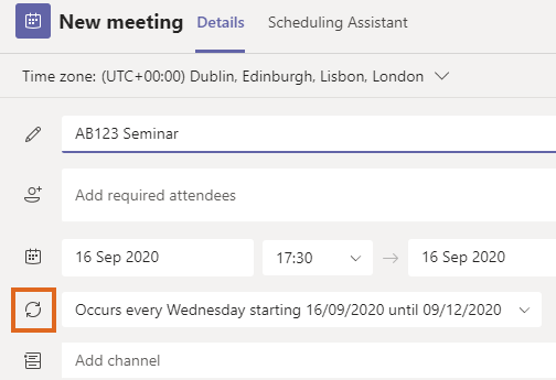 Home / Original Category Archive / Setting up live online sessions via Outlook or Teams calendar / Teams meeting – recurrence options Teams meeting – recurrence options Leave a Comment / By andyturner / September 17, 2020