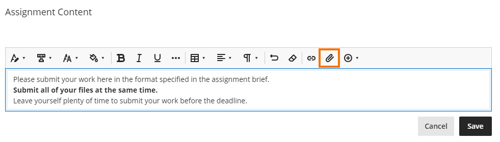 You can also click on ‘Attachment’ (the paper clip icon) to upload files, e.g. a Word or PDF file, in this area.