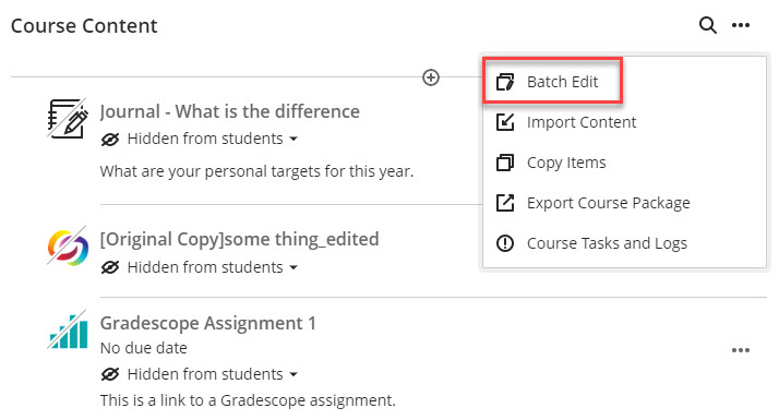 Home / Blackboard Learn Ultra / Batch Edit – Visibility/Dates/Delete / Batch Edit 1 Batch Edit 1By taralehane / April 12, 2023