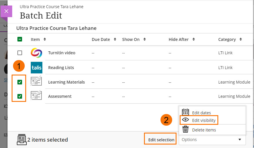 Home / Blackboard Learn Ultra / Batch Edit – Visibility/Dates/Delete / Batch Edit 2a Batch Edit 2aBy taralehane / May 11, 2023