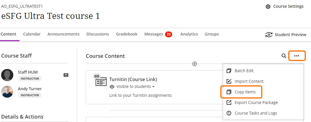 Step 1: In the Ultra course that you want to copy the Rubric(s) into, click on the three dots near the top right of the main course page, and select Copy Items.