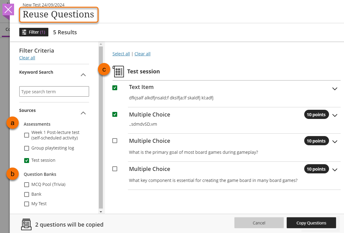 - In the Reuse Questions window sources are listed as Assessments (a) or Question Bank (b).