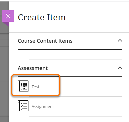 On the right side Create Item panel select Test.