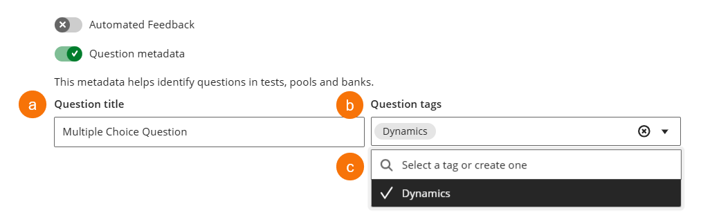 When creating or editing a question, instructors can enable Question Metadata, which allows them to attach custom tags to questions. Once created, these metadata tags can be reused across multiple questions.