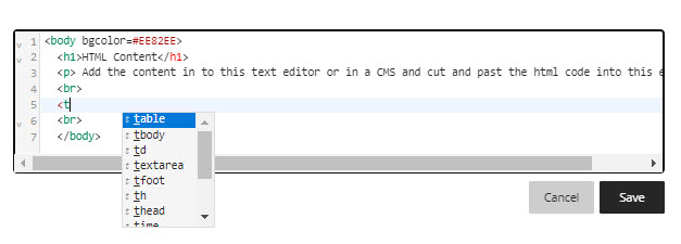 In the HTML text editor the code will display in various colours to distinguish it from the text, and a prompt of tags and attributes will display to aid your code writing.