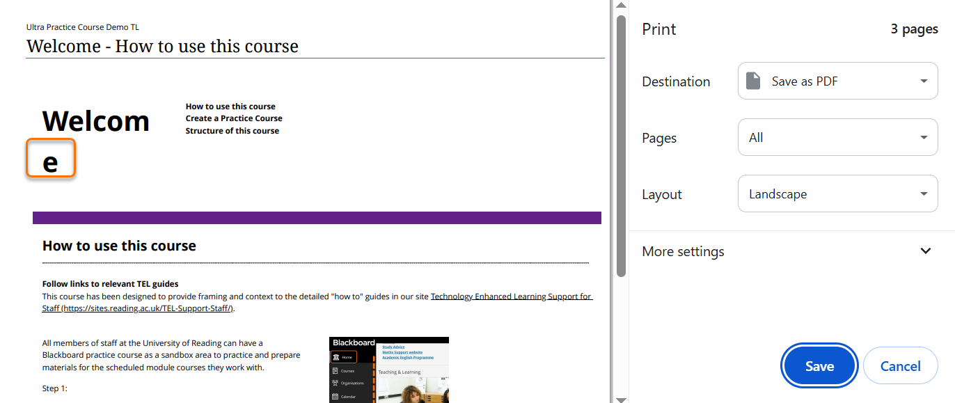 Documents can be opened and viewed by students in their course, allowing them to open files and play videos etc. It is also possible to print a Document on either paper or as a PDF document. The print button
