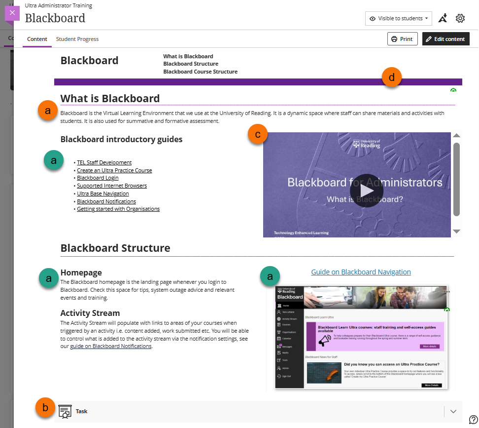 An Ultra Document is a way of organising materials on a course or organisation. They can be used in conjunction with Learning Modules and Folders.