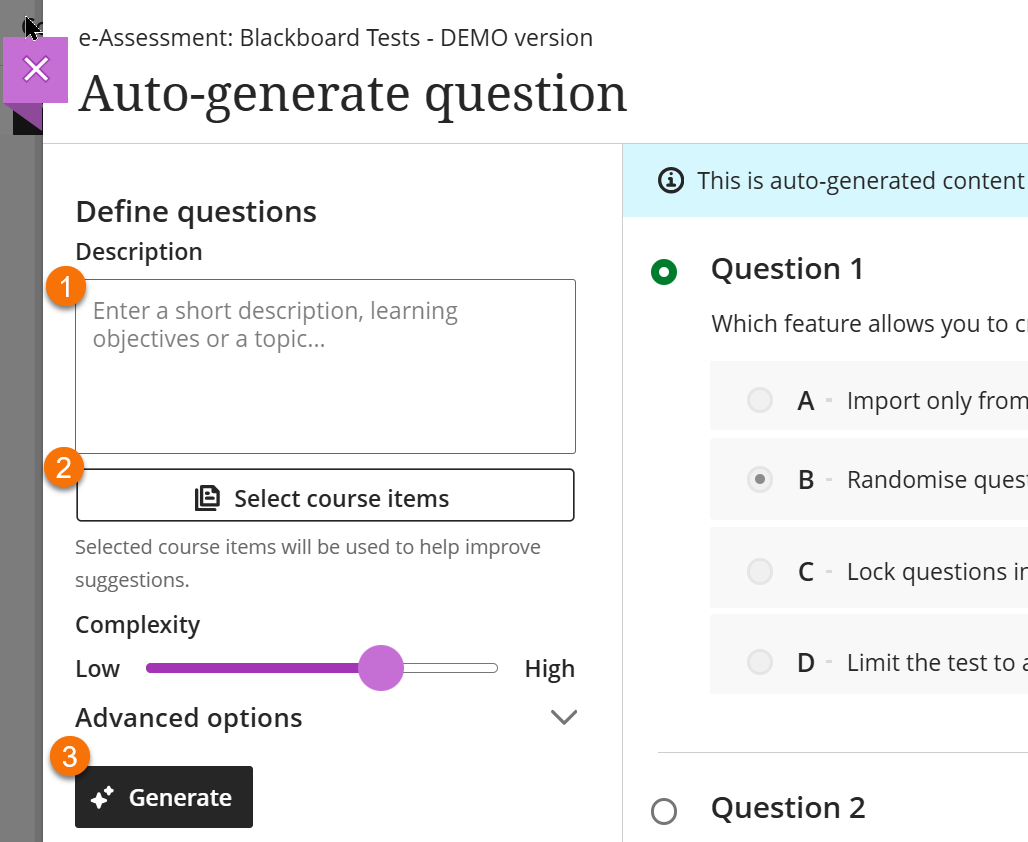 The Blackboard AI Design Assistant will automatically generate questions once selected. These questions will be based on the Document title. It is possible to add a description or select an item on the course as content to generate the question.