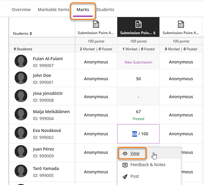 On the Marks tabs assigned markers will see all submissions and marked work, they can use the View option to see submissions not assigned to them. This view is not possible with anonymous marking until the marks are posted and anonymity is lifted.