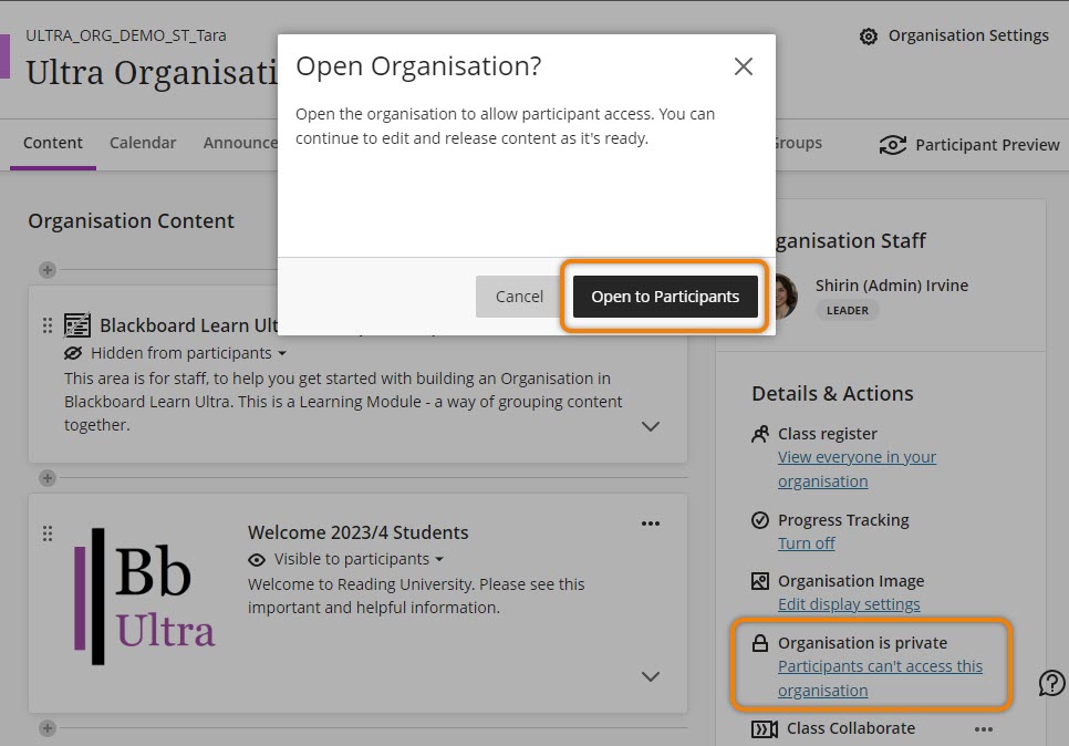 Once you have some basic information for students on your Ultra Organisation you can make the completed items visible to students while you continue to build your Organisation.
