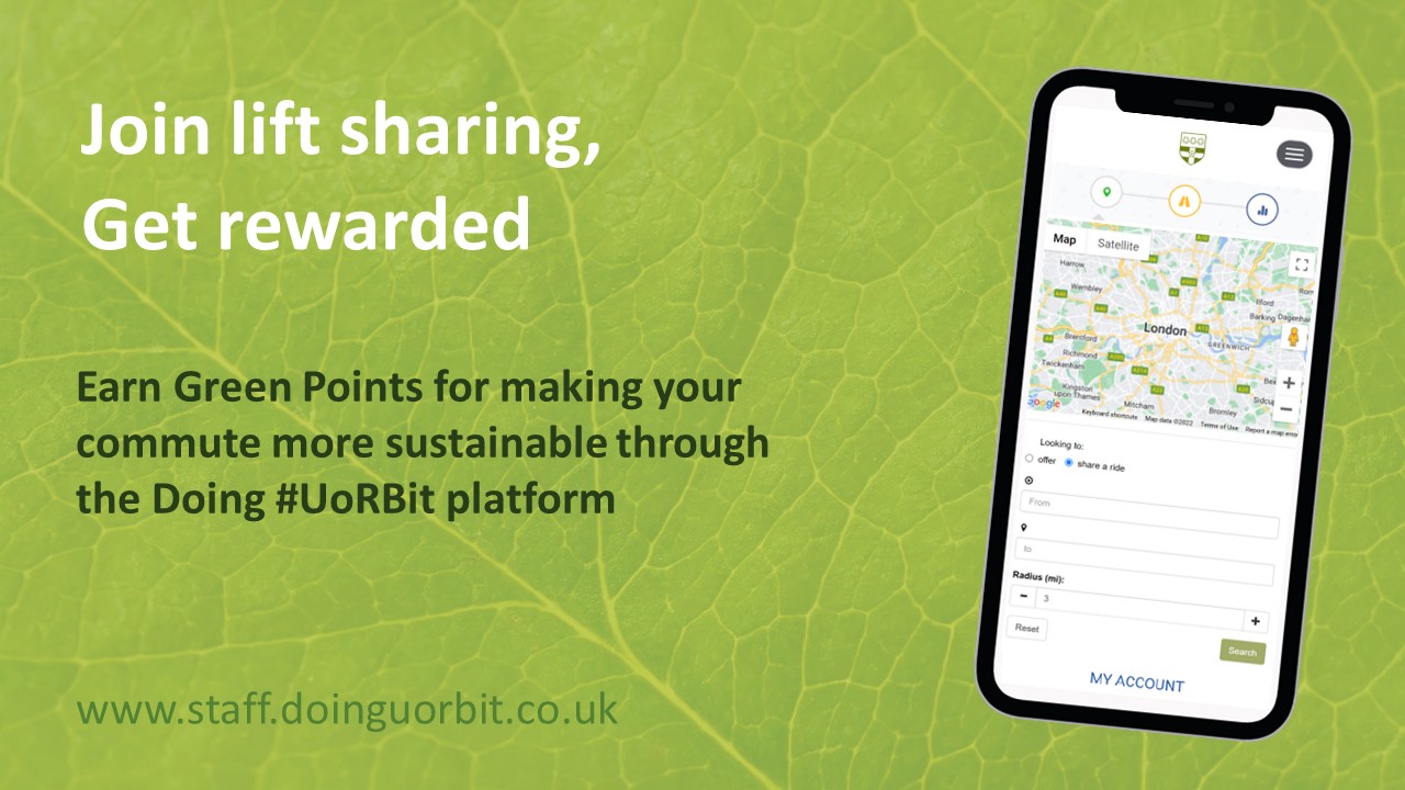 We’re pleased to announce that we have launched an exciting new lift share tool. This forms part of the Doing #UoRBit platform, allowing you to earn Green Points simply by lift sharing. Every month there is the chance to win a £20 voucher for those users who have earned the most Green Points!
