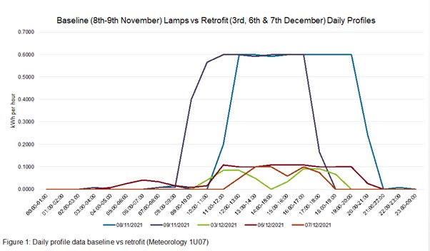 At our Greenlands campus, hundreds of old inefficient luminaires (a complete electric light unit) have been replaced with 26W LEDs (average per fitting). As a result, the replacements use less energy than the previous luminaires and create a better lit atmosphere across our onsite buildings. The graph below taken from the official report by Dr. Sam Mudie, our energy officer here in sustainability services, shows the amazing energy saving results. As you can see the kWh usage has dramatically decreased in the measured sample location since the new LED installation.