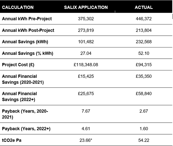 Table below: The pre- project and post project energy, carbon and financial saving calculations