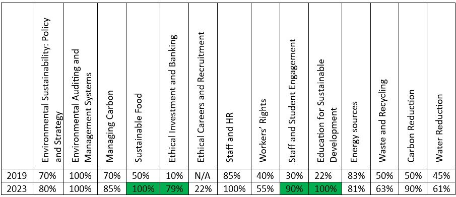 We scored only 10% in this area in 2019 but the overhaul of the University’s investment strategy has led to an increase in score to 79%. To achieve this, we have: divested from fossil fuels, excluded investments related to arms, excluded corporations in violation of international law and committed to directly invest in community owned renewable energy projects or renewable energy on campus.