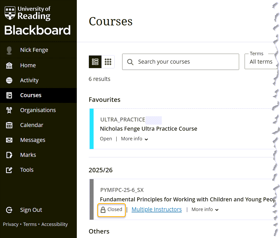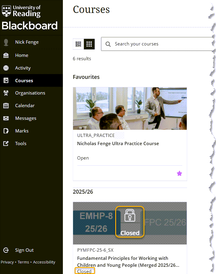 Any courses shown as ‘Closed’ are unavailable to students. Your lecturers will make courses available to you at an appropriate time. If there are any unavailable modules which you think you should already be able to access, please raise this with your lecturer.