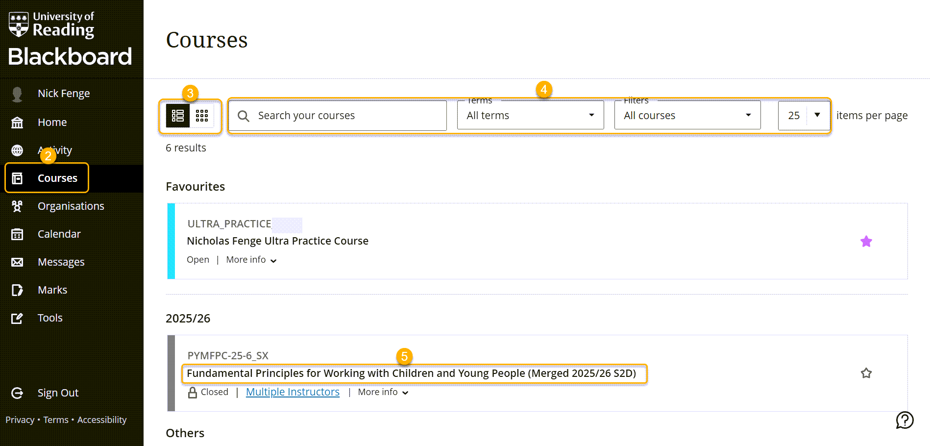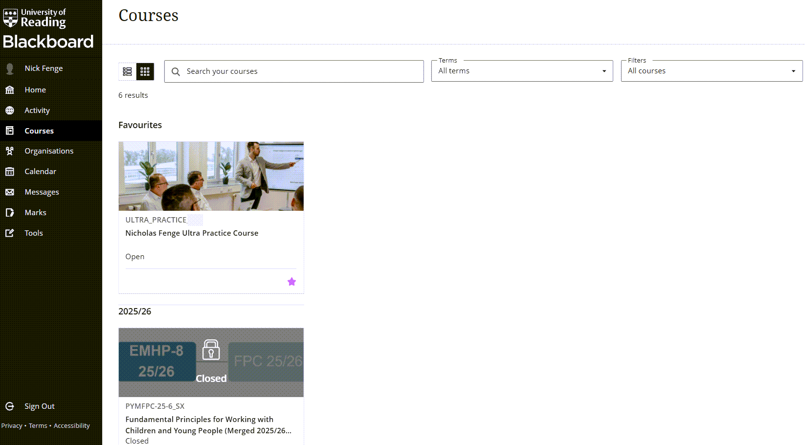 Courses: Courses in Blackboard normally represent a module, but they can also be used for a programme. You can view the list of Blackboard Courses you are enrolled on from the Courses area on the main Blackboard menu.