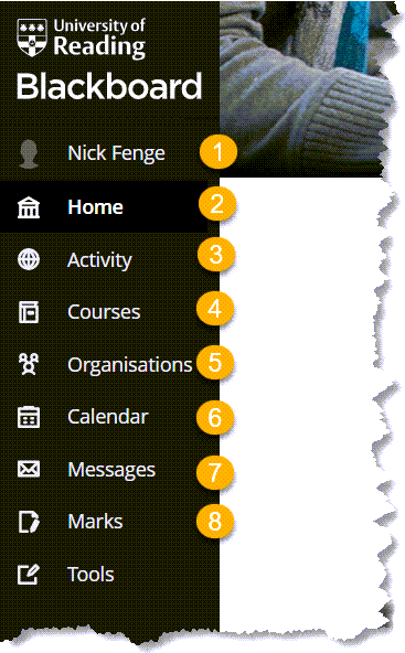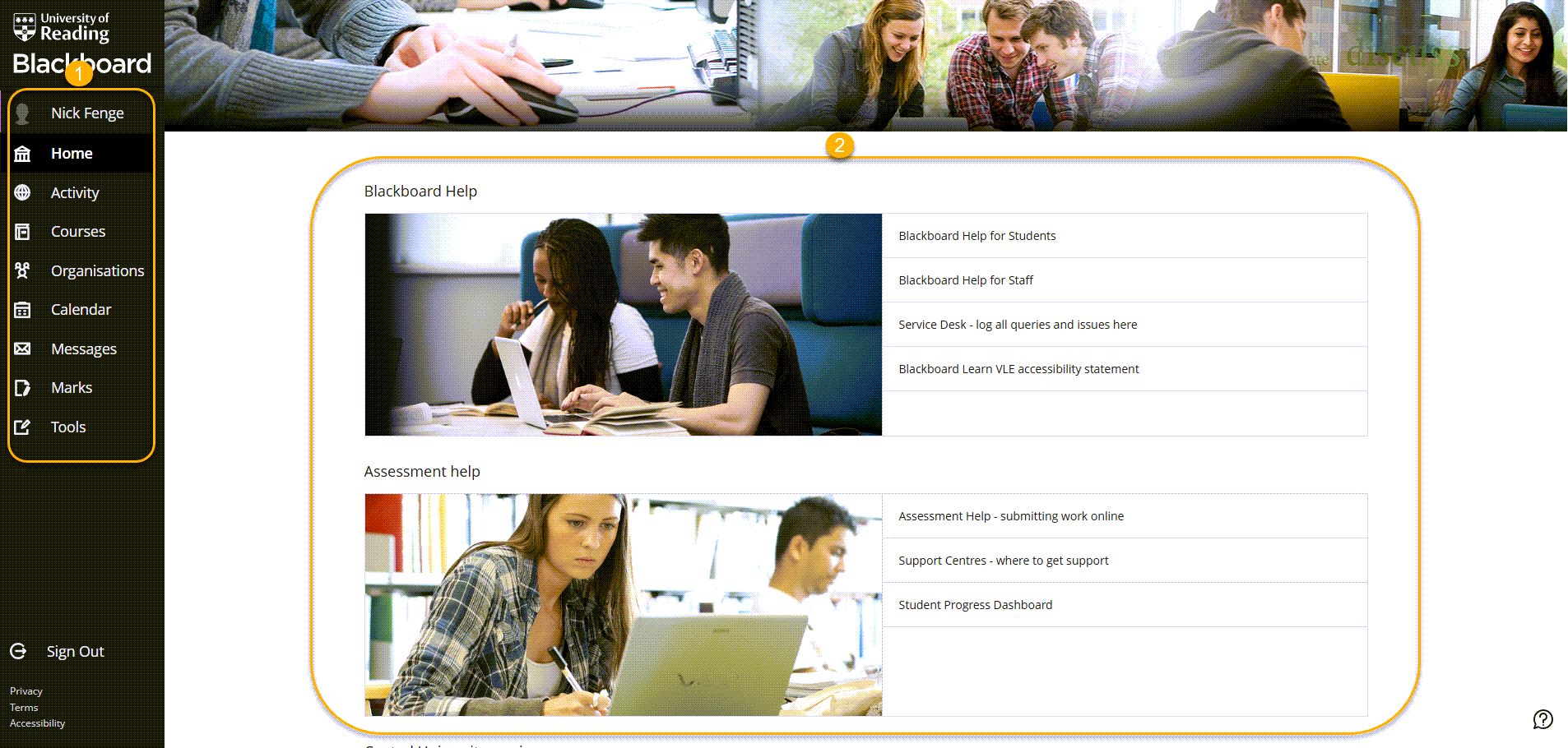 - Home Page – Links to sources of help, and is also where we’ll alert you to new features in Blackboard, or when relevant systems are undergoing maintenance work and may be unavailable.