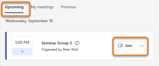 Once your lecturer sets up a Teams Meeting in Blackboard, you’ll be able to access it through the page of your Blackboard Course. Go to Upcoming meetings and then Join: