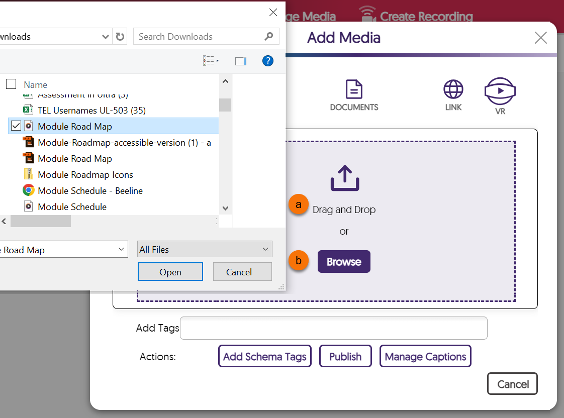 - Drag and drop your video file onto the Upload window (a) or use the Browse option to upload files from your local computer (b).
