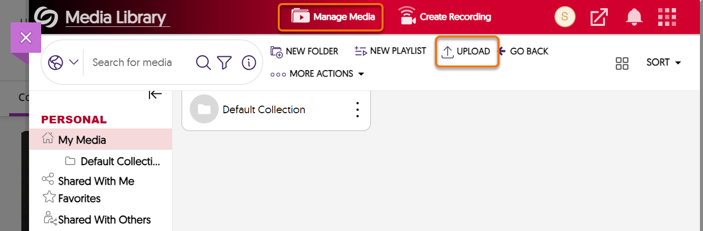 Go to Manage Media and select Upload from the top menu.