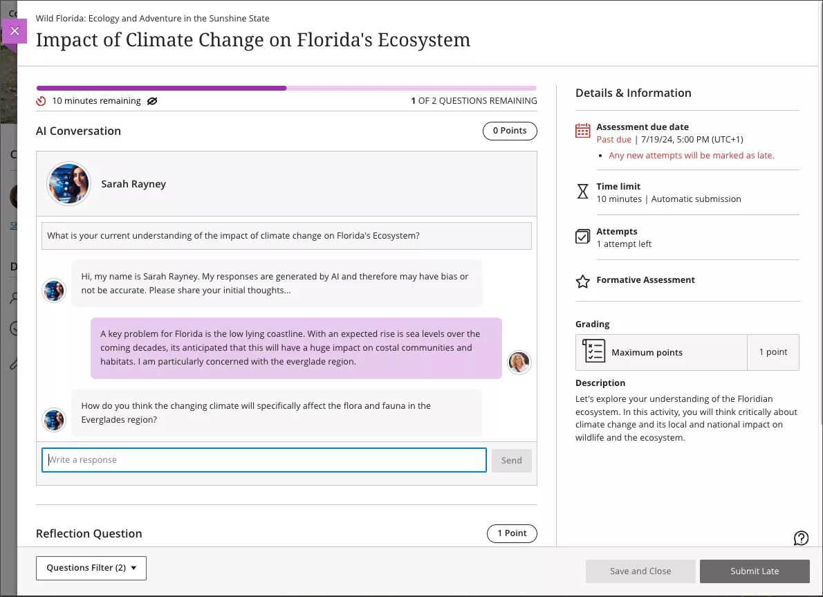 Upon completion of an AI Conversation you have the option to respond to a Reflection Question beneath the chat. You can view your submission, and a record of your AI Conversation, by clicking again on the activity title in your Course Content. Your Module Convenor can view your submission (including a record of your exchange with the AI bot) via the Course Gradebook. The academic staff view is displayed in the screenshot below, showing full details of when the tool was used, how long for and what was exchanged. Your Module Convenor may give feedback via Blackboard or the activity may be reviewed verbally as part of a scheduled study session.