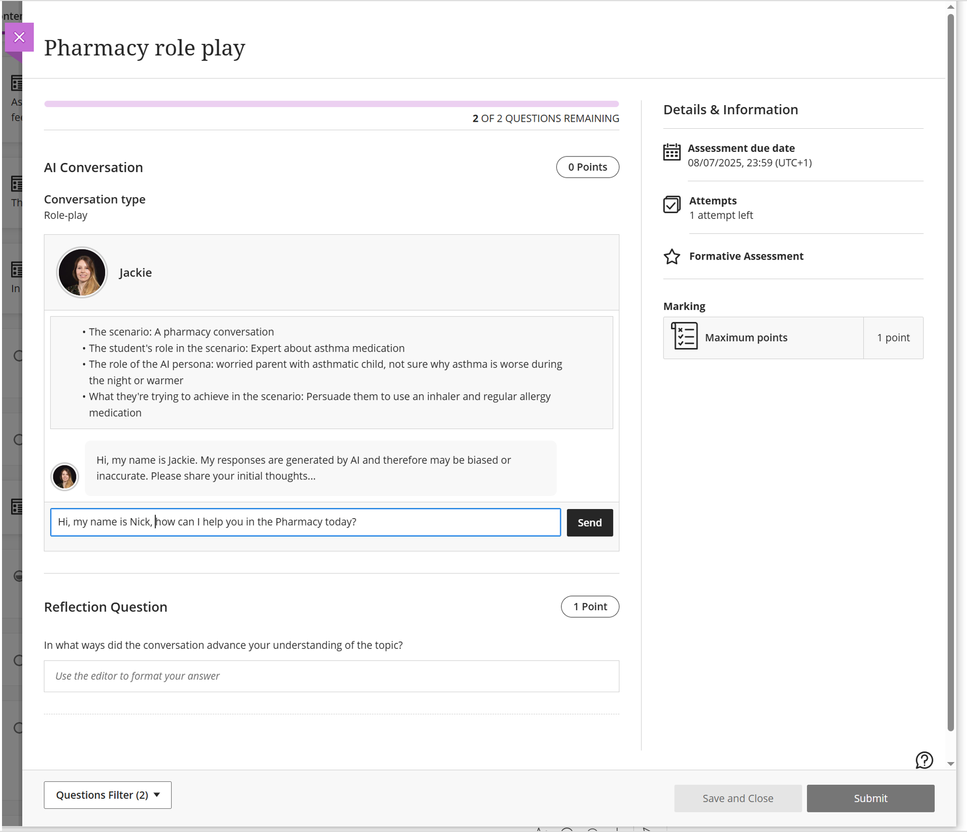 This is a guided questioning activity or Socratic exercise. The AI persona will not confirm or reject any response but will move you through a series of questions. At the end of the conversation, you can provide a reflection on the activity, highlighting weaknesses or strengths in your learning, or if the AI bot showed bias, hallucinations, or inaccuracies. On submission, your Module Convenor or lecturer will receive a transcript of the conversation and reflection, giving full transparency of the interactions. This is a great way to practice dialogue related to the course topics. .