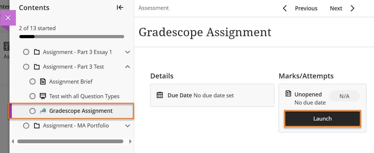 Access via the assignment from a Blackboard course. the assignment will open directly after clicking Launch from the pop out window.