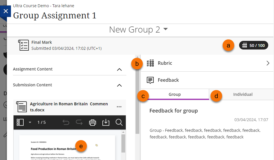 For Group assignments the marker will provide feedback to the whole group, this will be open as default when you open the marked submission.