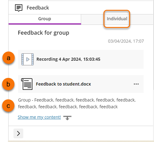 Your instructor may also decide to provide individual feedback for you specifically. If so this will be in the Individual tab and you can easily toggle back and forth between the tabs.