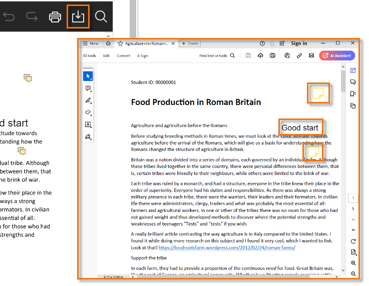 Your marker may choose to annotate your submitted paper with comments or inline text directly on the page. There are a number of features to allow you to navigate around paper to view the annotations.