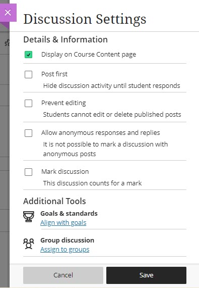 Display on Content Page – This can allow you to only link to the discussions through the Discussions Tab